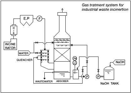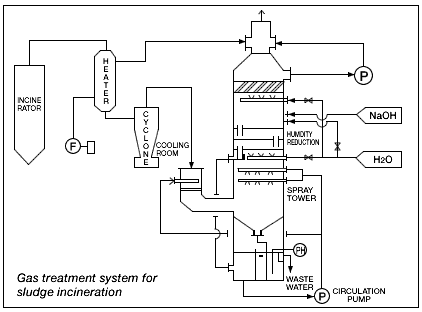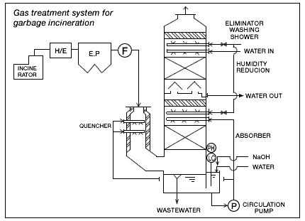 High temperature gas is cooled down at quencher. Gas collides with fluid on each perforated plate. After harmful gas is absorbed, gas will be discharged. Absorbing fluid is discharged from scrubber consecutively. After its COD content is decreased at oxidation tank and SS content is removed at SS-filter, cleaned water will be discharged.