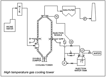 This cooling tower is fully evaporated system. If you adopt a system in which gas is reacted with calcium hydroxide in bag filter, before gas comes to the bag filter, gas must be cooled down by its temperature capacity.