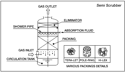 It is possible to choose various packing for this scrubber. Gas collides with fluid , then gas is absorbed effectively.
