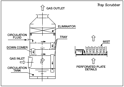 In the spray tower and tray scrubber, remaining dust and harmful gas is removed. Cooling water, which is supplied on the perforated plate, reduces gas humidity and also used for spray tower water. NaOH is mainly used for absorption.